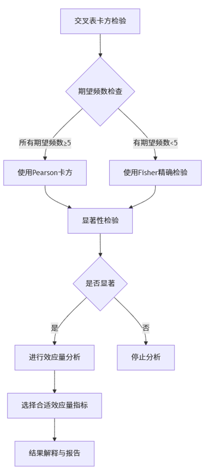 交叉表卡方检验分析流程图如下:先进行期望频数检查,所有期望频数≥5时使用Pearson卡方,有期望频数<5时使用Fisher精确检验;接着进行显著性检验,若显著则进行效应量分析(选择合适指标后解释报告),若不显著则停止分析。