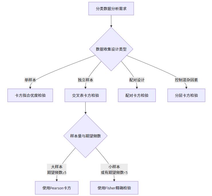 以分类数据分析需求为起点,根据数据收集设计类型分为单样本、独立样本、配对设计和控制混杂因素四类,分别对应卡方拟合优度检验、交叉表卡方检验、配对卡方检验和分层卡方检验;其中独立样本的交叉表卡方检验需进一步依据样本量与期望频数判断,大样本且期望频数≥5时用Pearson卡方,小样本或期望频数<5时用Fisher精确检验。