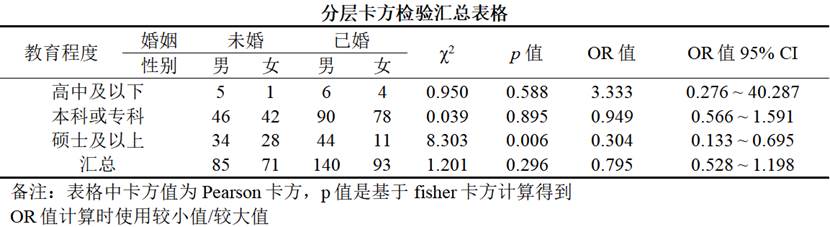 当研究两个变量关系时,可能存在第三个混杂因素影响结果,此时需要采用分层卡方检验。SPSSAU输出部分分层卡方检验结果示例如下: