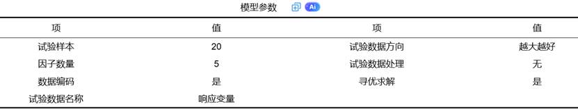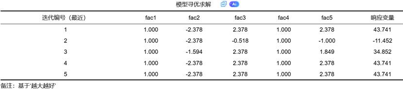 模型寻优求解:基于建立的数学模型,SPSSAU可以采用数值优化算法(如爬山法)在实验范围内进行迭代搜索,寻找能使响应值最优(最大、最小或接近目标值)的因素水平组合。
