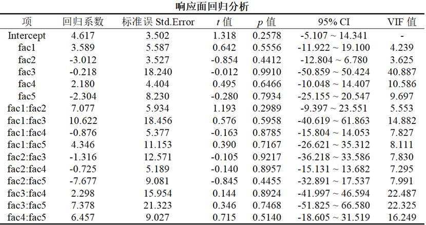 - 回归系数:反映了对应因素对响应值的影响方向和强度。正系数表示正向影响,负系数表示负向影响。