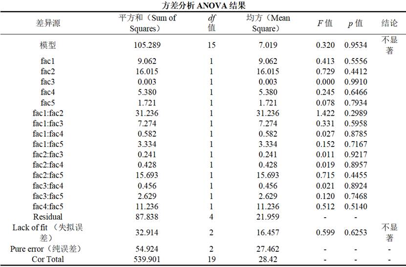 方差分析(ANOVA)是响应面分析的基石,用于判断模型和各个效应的统计显著性。