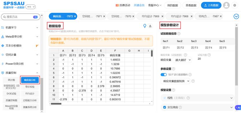 SPSSAU为响应面分析提供了集成化的解决方案: