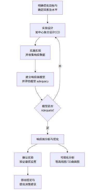 响应面分析(RSM)标准工作流程图:该流程始于目标的明确与实验设计,通过循环建模与诊断确保模型的可靠性,最终导向优化、验证与决策。这是一个迭代的过程,若模型不满足要求,需返回实验设计阶段进行调整。