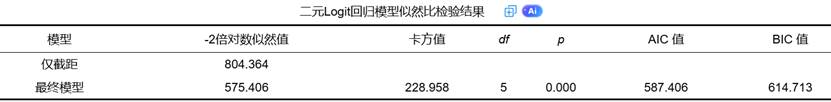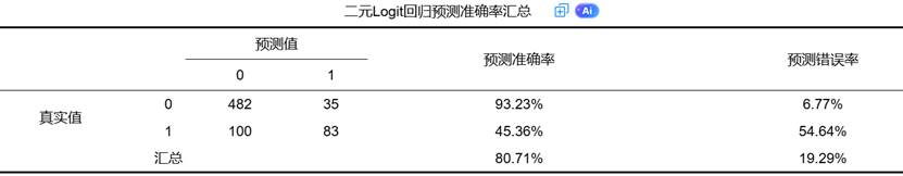 (1)预测准确率:通过交叉表形式展示模型对因变量类别的预测能力,包括整体预测准确率和各类别的预测准确率。一个理想的模型应在两个类别上都有较高的预测准确率。