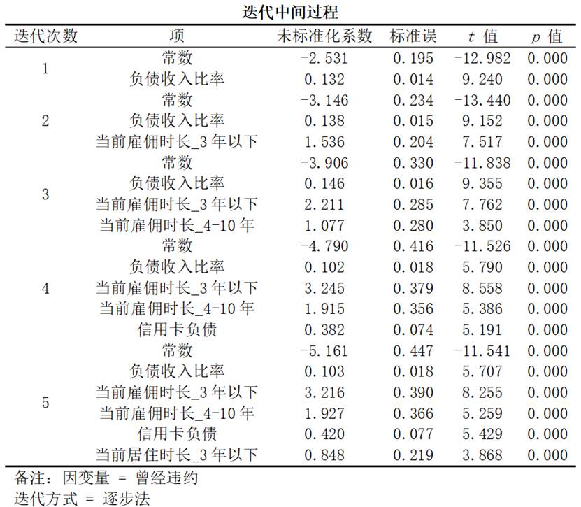 (3)迭代过程:展示模型构建过程中变量的进入和退出情况,反映了逐步法筛选自变量的逻辑和步骤。