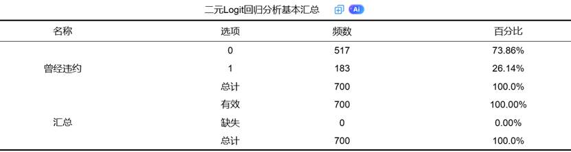 在二元Logit回归中,首先需要确认数据的基本情况,这是模型构建的基础。SPSSAU会自动提供数据概览,包括因变量分布、有效样本量等信息。