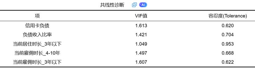 (2)共线性诊断:通过方差膨胀因子和容忍度判断自变量间的多重共线性问题。VIF值大于10或容忍度小于0.1表明存在严重共线性,可能影响系数估计的稳定性。