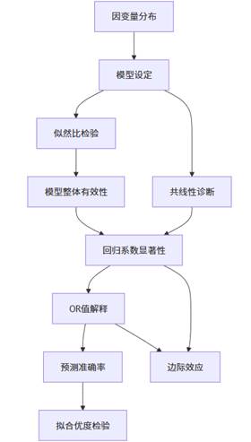上图展示了二元Logit回归中关键指标之间的逻辑关系。首先,因变量分布决定了模型的基本设定;模型整体有效性通过似然比检验确认;在此基础上,单个自变量的影响通过回归系数和OR值评估;而预测准确率和拟合优度检验则从不同角度验证模型的实用价值;边际效应将模型结果转化为更直观的概率变化;共线性诊断确保系数估计的稳定性。这一完整的证据链确保了模型结果的科学性和可靠性。