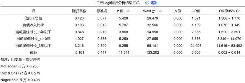 - Wald统计量:用于检验单个回归系数的显著性,服从卡方分布。当对应的p值小于0.05时,表明该自变量对因变量有显著影响。