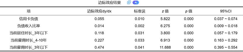 (1)边际效应:表示自变量在平均值处每增加一个单位,因变量为1的概率变化量。它提供了比OR值更直观的解释,特别在政策分析和业务决策中更为实用。