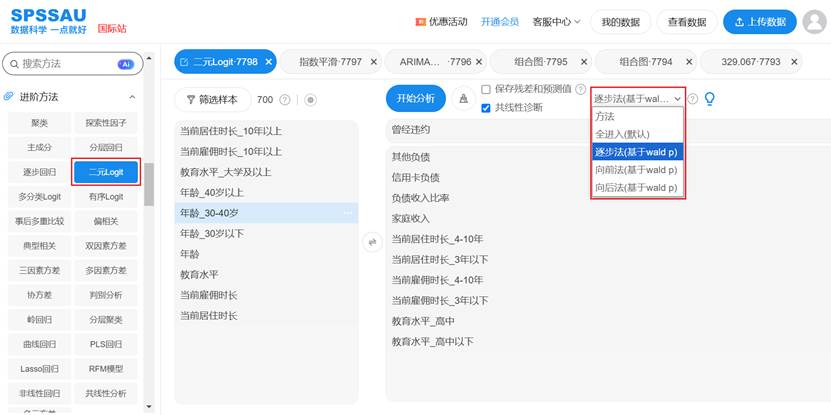 SPSSAU进行二元Logistic回归分析时,自变量进入模型的方式有全进入法(默认)、逐步法(基于Wald p)、向前法(基于Wald p)、向后法(基于Wald p),操作如下图: