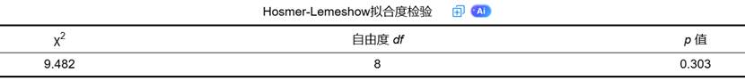 (2)Hosmer-Lemeshow检验:评估模型预测概率与实际观测结果之间的一致性。当p值大于0.05时,表明模型拟合良好,预测值与观测值无显著差异。