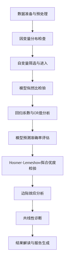 SPSSAU中的二元Logit回归分析遵循严谨的统计流程,确保分析结果的科学性和可靠性。以下是完整的分析步骤: