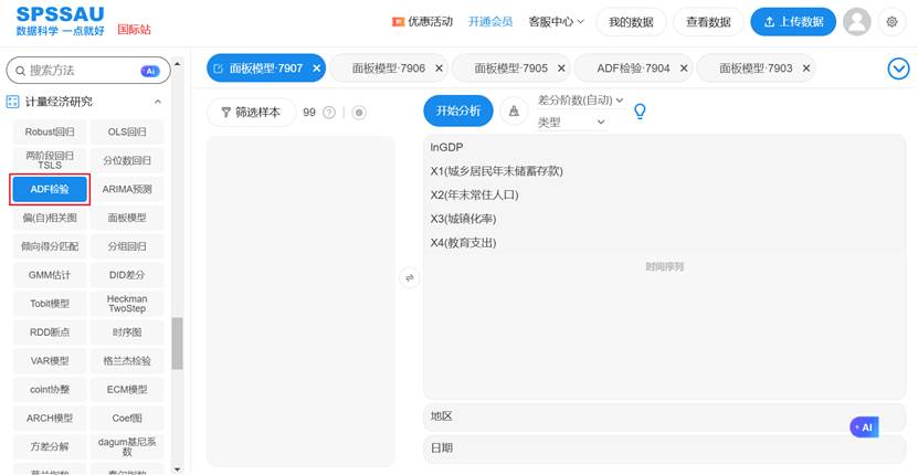 SPSSAU实战示例:在【计量经济研究】模块选择【ADF检验】,操作如下图: