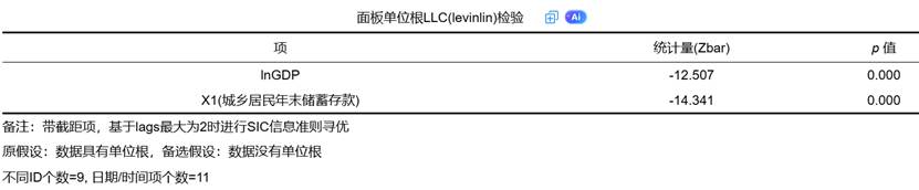 LLC检验适用于平衡面板,且对“N小T大”型数据(截面数少、时期数多)较为有效。在实际操作中,我们通常关注其*p*值:若*p* < 0.05,则拒绝原假设,认为数据平稳。