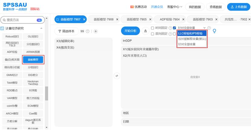 SPSSAU实战示例:在【计量经济研究】模块选择【面板模型】,勾选LLC检验和IPS检验,操作如下图: