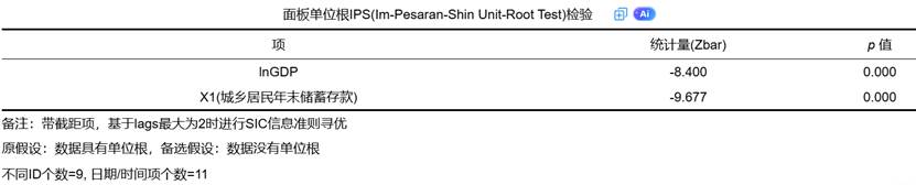 (2)若为非平衡面板或截面数较多,建议使用IPS检验