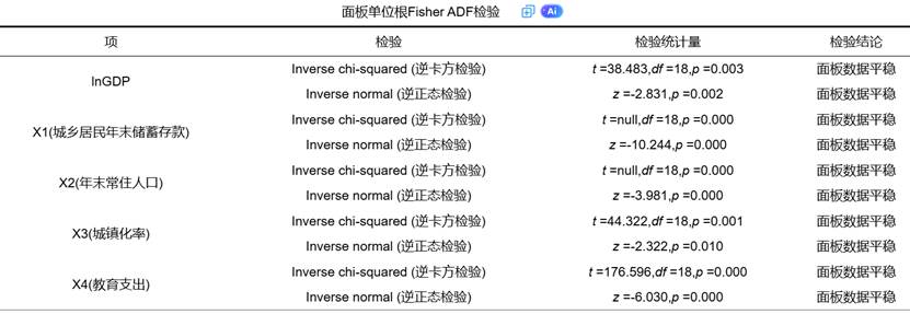 我们对多个变量进行Fisher-ADF检验,SPSSAU输出分析结果如下: