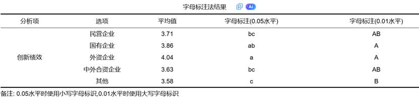 在SPSSAU的“字母标注法”中:使用 小写字母 表示 0.05 显著性水平;使用 大写字母 表示 0.01 显著性水平;若两组共享相同字母(如 “a” 与 “ab”),说明它们之间无显著差异;若字母完全不同(如 “a” 与 “b”),则说明存在显著差异。