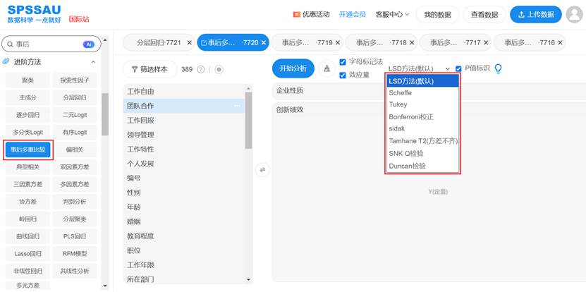 SPSSAU通过方法集成、智能推荐、可视化呈现等方式,将这一复杂统计过程变得简单易用,让研究者能够专注于结果解读和理论构建,而非技术细节。无论是学术研究还是商业分析,SPSSAU都能为您提供专业、可靠、高效的事后检验解决方案。