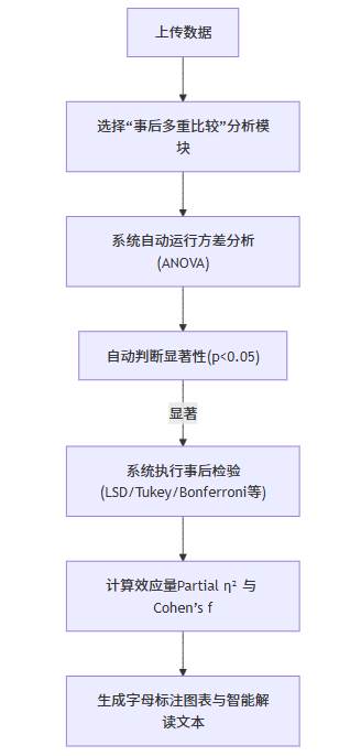 在 SPSSAU 中,这一整套流程由系统自动衔接完成。用户只需选择“事后多重比较”功能,SPSSAU 会自动运行 ANOVA 检验、生成事后比较表、并附带智能文字分析。