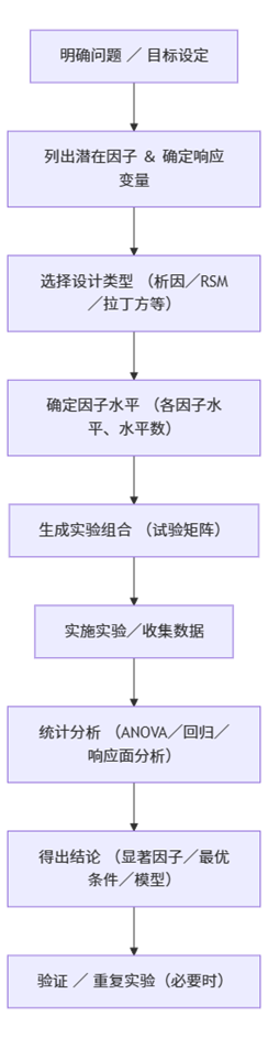 一个标准的 DOE 流程包括:明确目标 → 选择因子 & 响应 → 设计实验矩阵 → 执行实验 → 收集数据 → 统计分析 → 得出结论 → 验证 / 重复。