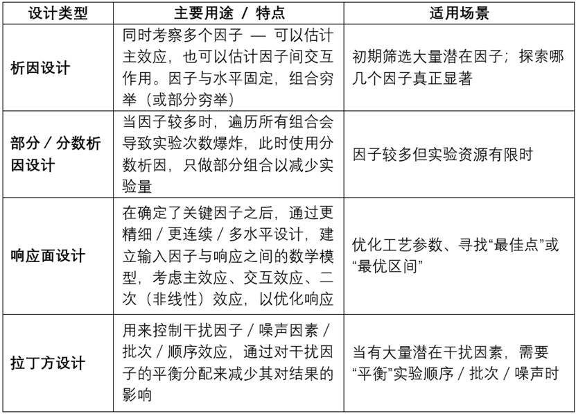 DOE 并不只有一种形式,而是包含析因设计、响应面设计、拉丁方设计等多种设计方案,应根据研究目的(筛选、优化、噪声控制等)选择最合适的一种。