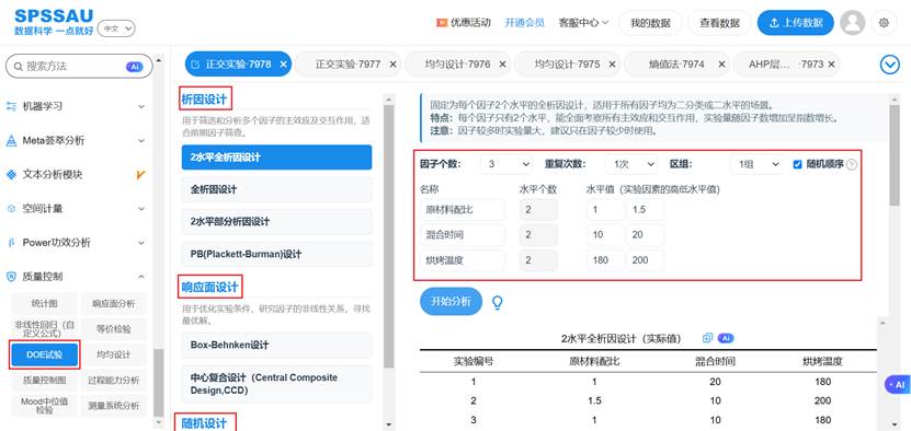 正是在这种背景下,SPSSAU 推出了它的 “质量控制”模块 中的 DOE 实验设计功能。对于工程师、质量管理人员、产品开发者、工艺设计师、科研人员来说,这意味着: