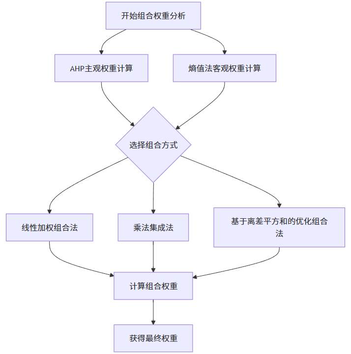 组合权重理论框架:单一赋权方法各有局限性,AHP法受主观因素影响较大,而熵值法可能忽视指标的实际重要性。将两者结合的组合赋权法能够兼顾主观经验与客观数据,获得更科学的权重结果。下图为组合权重计算流程图: