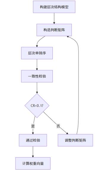 - CR值(一致性比率):CI值与同阶随机一致性指标RI值的比值,当CR<0.1时,认为判断矩阵的一致性可以接受。