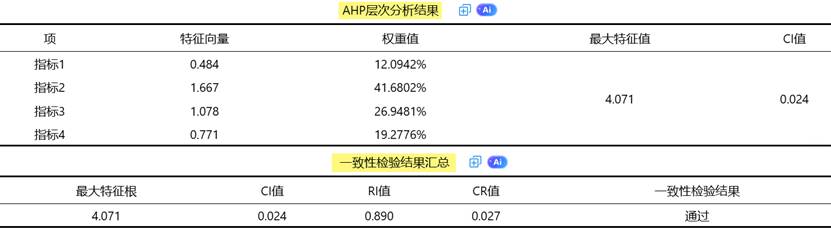 在SPSSAU的AHP分析结果中,包含多个关键指标,每个指标都具有明确的理论意义: