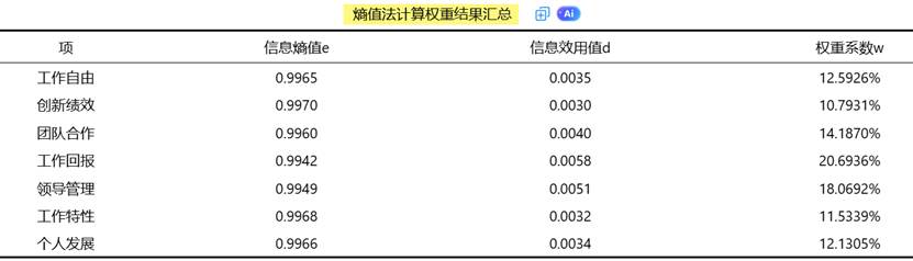 熵值法的核心优势在于其客观性,权重完全由数据本身的特征决定,不受人为主观因素的影响。SPSSAU在计算过程中自动处理了数据标准化、缺失值等问题,确保结果的科学性。SPSSAU输出熵值法计算结果示例如下: