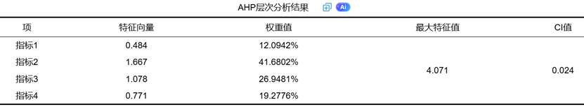 呈现了AHP分析的核心产出。特征向量表征了各指标在系统中的相对影响力,权重值则将这种影响力转化为百分比形式,使得各指标重要性一目了然。最大特征值是判断矩阵的一个重要数学特征,为后续的一致性检验提供基础。