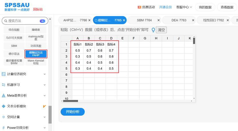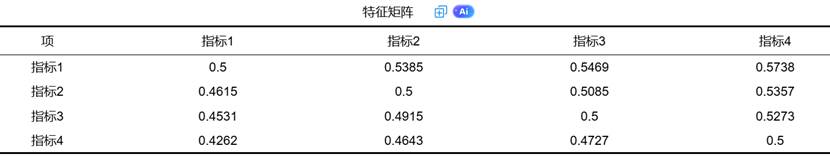 模糊互补矩阵是FAHP分析的起点,采用0.1-0.9标度表示指标间的相对重要程度。与AHP的判断矩阵不同,模糊互补矩阵的对角线元素均为0.5,表示指标与自身同等重要;对称位置的两个值之和恒为1,体现了模糊判断的互补特性。SPSSAU进行模糊层次分析法操作示例如下: