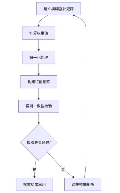 FAHP在传统AHP基础上引入模糊数学理论,更好地处理人类判断中的不确定性和模糊性。上图展示了FAHP的分析流程:从构建模糊互补矩阵出发,通过数学变换计算初始权重,经过归一化处理后得到最终权重,同时构建特征矩阵并进行模糊一致性检验,确保结果的合理性。
