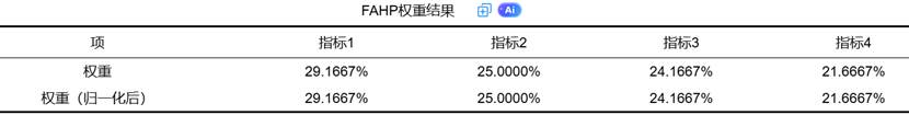 展示了模糊层次分析的最终产出。权重值反映各指标在模糊环境下的相对重要性,归一化处理确保所有权重之和为100%,便于实际应用中的解释和比较。