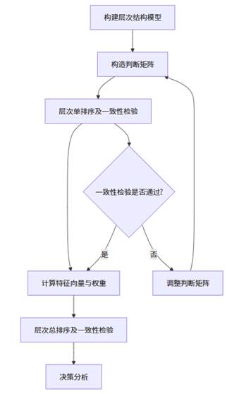 AHP层次分析法的核心在于将复杂问题分解为多个层次和因素,通过两两比较的方式确定各因素的相对重要性。上图清晰地展示了AHP分析的完整流程:从构建层次结构开始,到构造判断矩阵,接着进行一致性检验确保逻辑合理性,最后计算权重并进行决策分析。整个过程环环相扣,确保权重计算的科学性和可靠性。