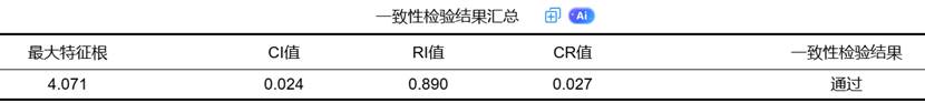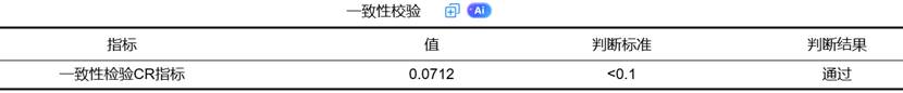 是FAHP分析的质量控制环节。与AHP类似,FAHP也需要通过一致性检验来确保判断的合理性,CR值小于0.1是通用的通过标准。