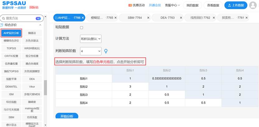 判断矩阵是AHP分析的基础,它体现了决策者对各项指标相对重要性的专业判断。该矩阵具有三个重要特性:对角线元素均为1(指标与自身比较重要性相等)、矩阵互为倒数对称(若A对B的重要性为x,则B对A的重要性为1/x)、数值大小反映相对重要性程度。SPSSAU分析时选择计算方法(和积法或方根法)、选择判断矩阵阶数、填写白色单元格,点击开始分析按钮即可,操作示例如下: