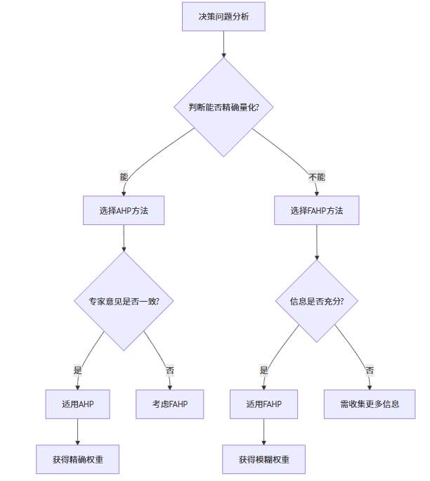 选择AHP还是FAHP取决于决策问题的特性和可用信息的质量。当决策环境稳定、指标关系明确、专家意见一致时,AHP能够提供精确的权重结果;当决策环境复杂、存在不确定性、专家判断具有模糊性时,FAHP则更为适合。