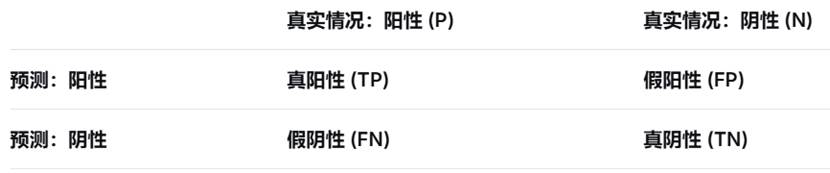 这个矩阵中的四个核心计数(TP, FP, FN, TN)是所有评价指标的源头。