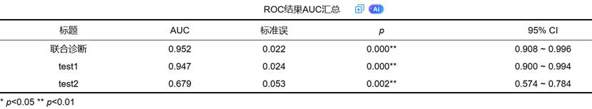 查看AUC值及其95%置信区间。例如,test1的AUC=0.947(0.900-0.994),test2的AUC=0.679 (0.574-0.784)。