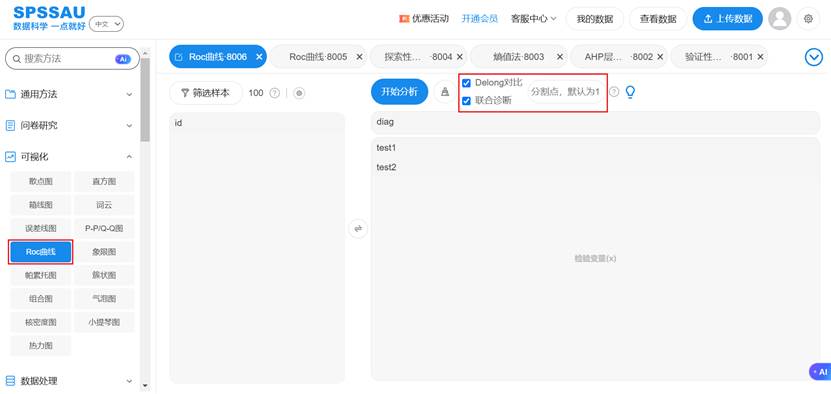 - 尝试联合诊断:SPSSAU分析前勾选【联合诊断】按钮即可。
