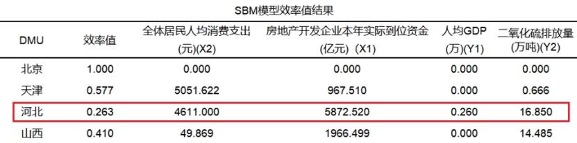 以河北省为例:河北省的效率值为0.263意味着投入产出效率较低。