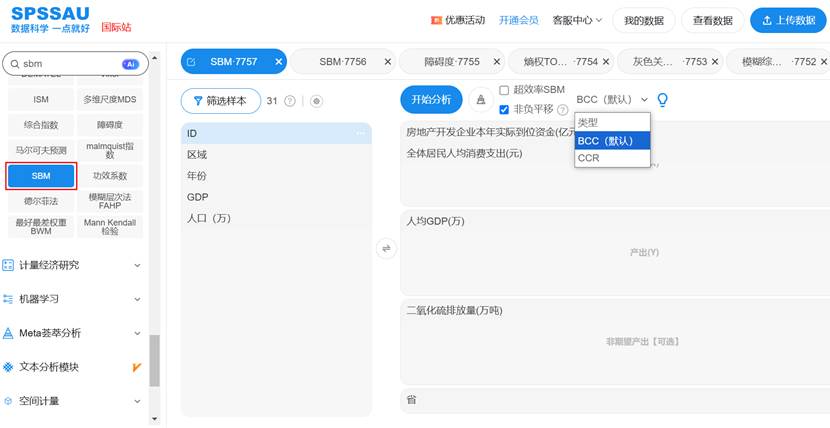 首先,用户需要在SPSSAU平台中准备并输入数据,包括决策单元(DMU)及其对应的投入、期望产出和非期望产出指标。接下来,用户选择SBM模型并根据研究需求设置参数,可选择BCC或CCR模型。然后,平台自动定义指标类型,计算每个DMU的效率值,并分析松弛变量。松弛变量反映了资源配置的改进空间,例如投入过量或产出不足。最后,SPSSAU生成详细的结果报告和可视化图表,帮助用户识别效率低下的原因并提出优化建议。