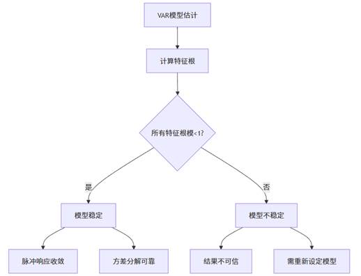 稳定性是VAR模型有效的前提。不稳定的模型会导致脉冲响应不收敛、方差分解无意义,预测结果偏离实际。SPSSAU自动生成AR根图,并给出明确的稳定性判断,确保后续分析建立在可靠基础上。