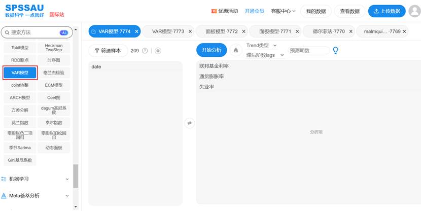 SPSSAU作为一款智能统计分析平台,在VAR模型分析上实现了流程化、自动化的操作体验。用户无需编写复杂代码,通过界面点选即可完成从模型设定到结果解读的全过程,大大降低了多变量时间序列分析的技术门槛。