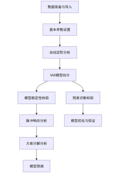 上图展示了SPSSAU中进行VAR模型分析的完整流程。这一流程遵循从模型设定到结果应用的逻辑顺序,确保每个环节都建立在前面分析的基础上。SPSSAU的智能化体现在:系统会自动完成技术性较强的步骤(如滞后阶数选择),同时为用户提供专业的解读指南,即使是初学者也能顺利完成复杂的多变量时间序列分析。