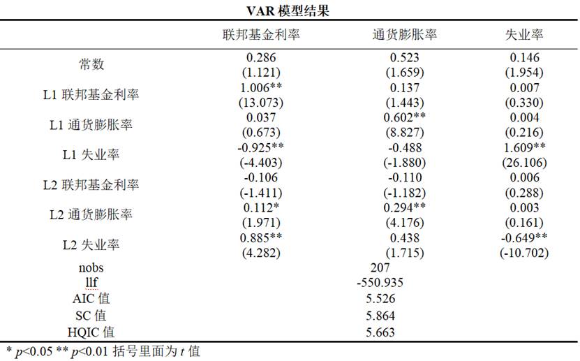 VAR模型结果表格展示了各变量及其滞后项之间的动态关系。解读要点包括: